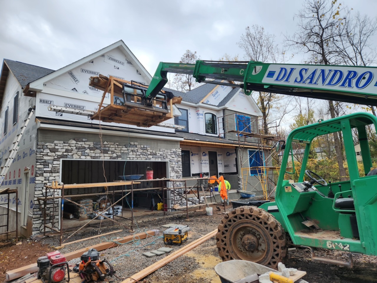 Construction materials including gravel, pavers, and equipment are neatly staged on site.