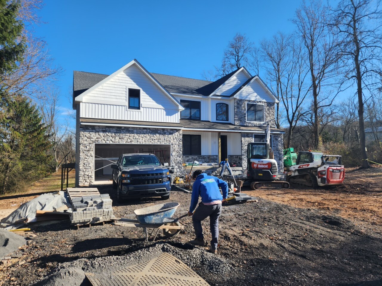 Excavation and base prep are actively underway for a new driveway or hardscaped entry path.