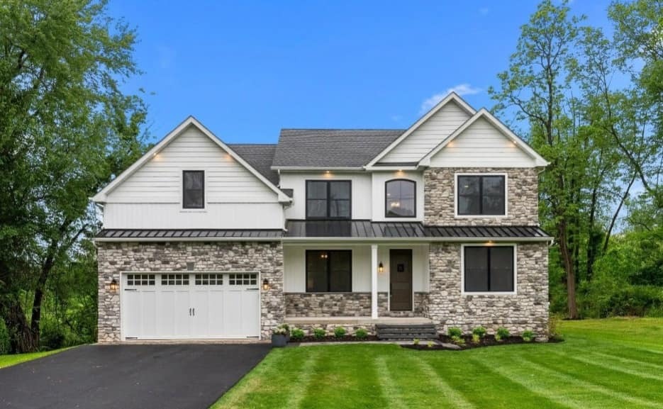 Vertical board-and-batten siding on the upper façade for a modern farmhouse look.